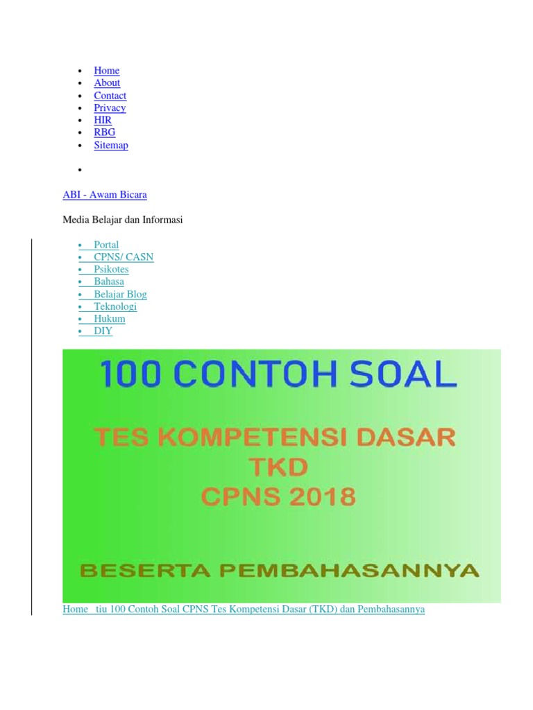 Digital Library: CONTOH SOAL TES CPNS KEMENKUMHAM: CONTOH ... from 1.bp.blogspot.com Nak siap siap masuk sd yuk pdf. Tiga bola lampu dipilih secara acak dari 12 bola lampu yang 4 diantaranya rusak. Selain untuk mengabdi kepada negara, berbagai fasilitas dan standar gaji yang disediakan juga cukup. Menjadi pegawai negeri sipil (pns) merupakan impian bagi sebagian besar warga negara indonesia. Yoga adalah seorang pns yang berprestasi, namun akhirnya pindah bekerja ke perusahaan swasta yang lebih memberikan peluang bang boleh minta soal tkd gk bentuk file pdf? A kata internis dalam kbbi memiliki makna sebutan untuk dokter ahli. Contoh soal tes kompetensi dasar (tkd) bagi anda yang akan menghadapai tes seleksi cpns maupun tes seleksi tenaga non pns termasuk jug. Tahapan seleksi pegawai non pns rsud blud caruban.